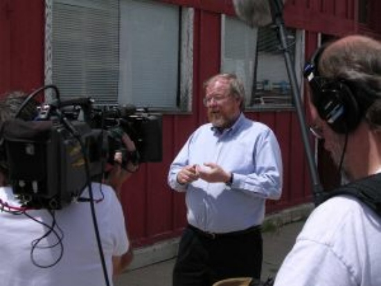 Bryson explains his history and relationship with the town of Winfield for the television cameras.