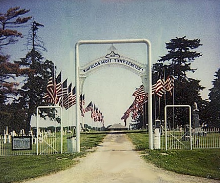 There are two burial sites outside of the cemetery. One is in the timber west of where Terry and Page Kepper Cornick live. Click here for an arial view of this timber location. They were the Hockrietors, early settlers here, related to Briggs. A couple stones from the timber have been moved to the cemetery inscribed Bartholomew Hockrietor, 1870, age 82; and Eliza, 1872, age 60. (Others buried in the Hochreiter or Kepper Cemetery, Scott Township, Henry County, Iowa, Section 9 areWilliam H. Bennett, d. 20 April, 1855 at thirty-seven years of age and his son, John G., who died in 1857 at five years of age. Thomas N. Dodds died the 15th of May, 1857, aged 30 years 11 months. Ervin Gordon died 1857 at twenty-six years of age. William Hale, son of J. P. & M. E. L. Hale, died in 1851 age one month. Mary Elizabeth Hinkle, daughter of A. & S. Hinkle, died 1856 at age fifteen years. Sarah Jane Hoover, wife of G. Hoover, died the 8th of April, 1854, aged thirty-six years, nine months and twenty-five days. Benjamin Shockley died November 5, 1849, aged sixty-nine and his wife, Salley, died in 1847 at the age of sixty. Caroline Hochreiter, daughter of B. & E. Hochreiter died in infancy.) Also, northwest of Winfield, on the old Lloyd Howser farm, where Melvin Huston now lives, is the grave of Adam Richie. After he died his wife took their children and joined a wagon train on the Oregon Trail and settled in Oregon.