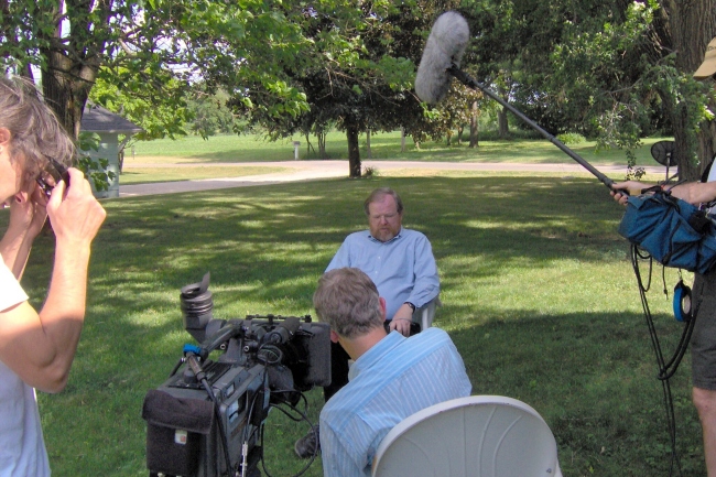 The crew, which arrived in Winfield after a week of filming in Des Moines, began filming at the Winfield Museum and Main St. They later planned to head out to the surrounding area and film a farm. (webmaster note: They filmed at the Lavonne Klopfenstein farm and interviewed Steve Klopfenstein about the changes in agriculture.)