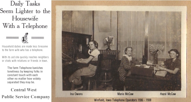 In 1940 my husband, Buck, visited with Walter Schrupp at the Hedrick Journal where he was visiting his brother-in-law, Ralph Jones. Mr. Schrupp, after visiting with Buck for some time, asked Buck if he could send him an application for a job with the Telephone Company. Buck told him to send one.