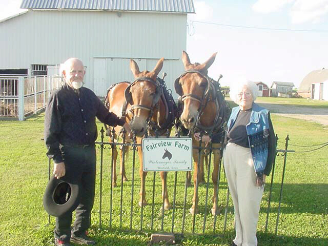 One doesn't think about the Wintermeyers without the picture of a team of mules (mother is a horse, father is a jack, so I'm told). They have a covered wagon that they give rides in and have been involved in many parades, including past Crooked Creek Day parades. While son Ed now owns the mules, some are housed at Fairview Farm and Bill and Mary enjoy having them. Bill also commented that he and Ed went to the saw mill and purchased oak with which they together made their own show wagon.